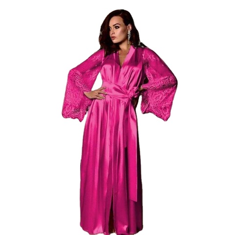 Bata larga de satén de encaje para mujer, ropa de dormir de seda, lencería, Kimono con cinturón, camisón